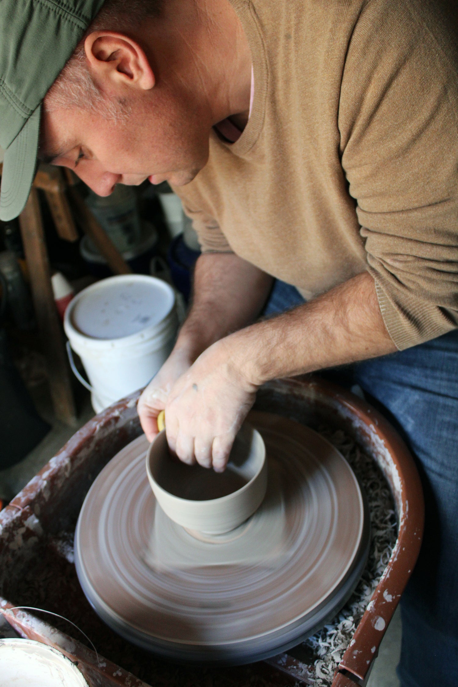 Chris makes wheel thrown pottery in Asheville, North Carolina. Taking a break from his professional cooking career, he began pottery classes after his second daughter was born, and continued them while he was a stay at home dad. He spent many nights in a shed in his backyard with his wheel, practicing and perfecting his skills. Three years later, when the restaurant he worked for was destroyed by Hurricane Helene, he decided to take his pottery to the next level and started selling it locally and online.