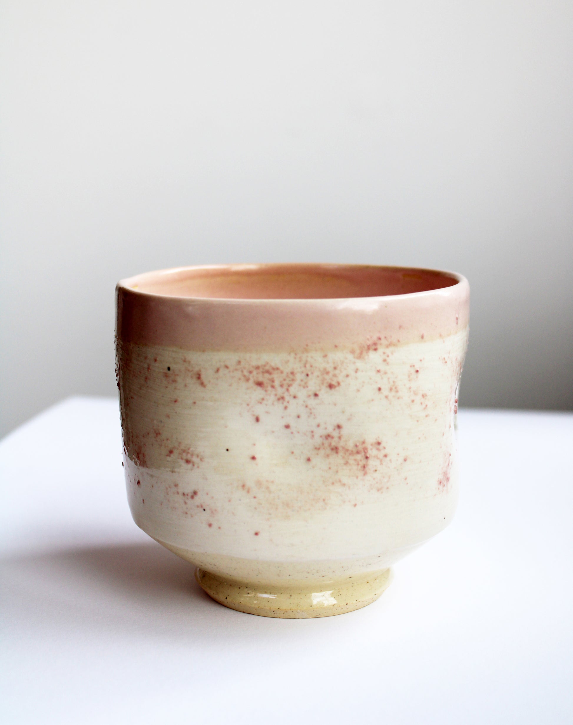 One wheel thrown and hand altered thumb cup on buff clay. Decorated with white slip applied with pine needle brush and pink slip dust. Interior house-made pink glaze and exterior clear glaze. Exact dimensions on handmade products will vary somewhat but each holds around 16oz of liquid.
